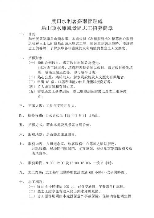 為推廣水利教育及在地人文歷史,農田水利署嘉南管理處辦理烏山頭水庫風景區志工招募,歡迎熱心公益、樂於服務民眾,且對水利設施及歷史文化有興趣之社會人士踴躍報名參與。